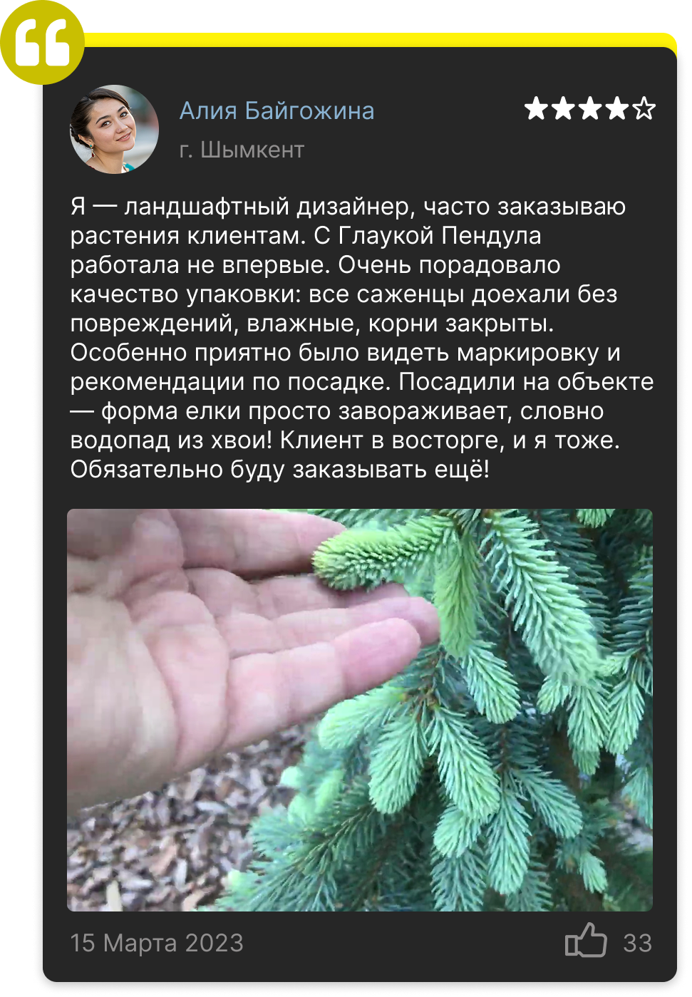 Мы отправляем только лучшие саженцы ели Глаука Пендула — редкие, эффектные и полностью адаптированные к климату Казахстана.